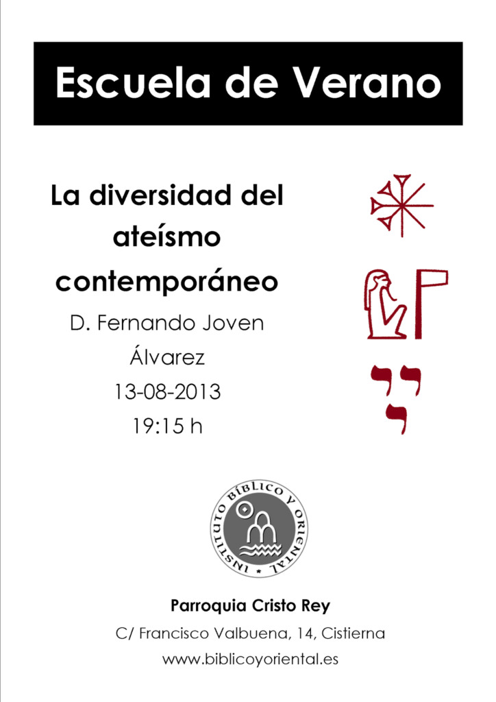 La segunda conferencia, que será a las 19:15, correrá a cargo de D. Fernando Joven Álvarez, que hablará sobre la diversidad del ateísmo contemporáneo.